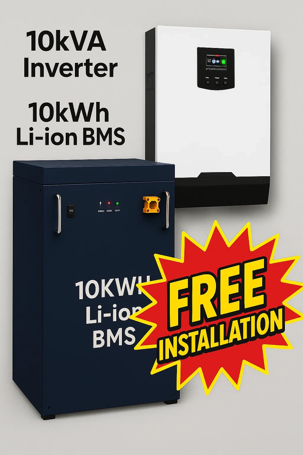 Experience total energy independence with the 10kVA Solar Inverter Package (10kWh Li-Ion BMS Battery) — smart, silent, and sustainable power with free installation and full technical support.