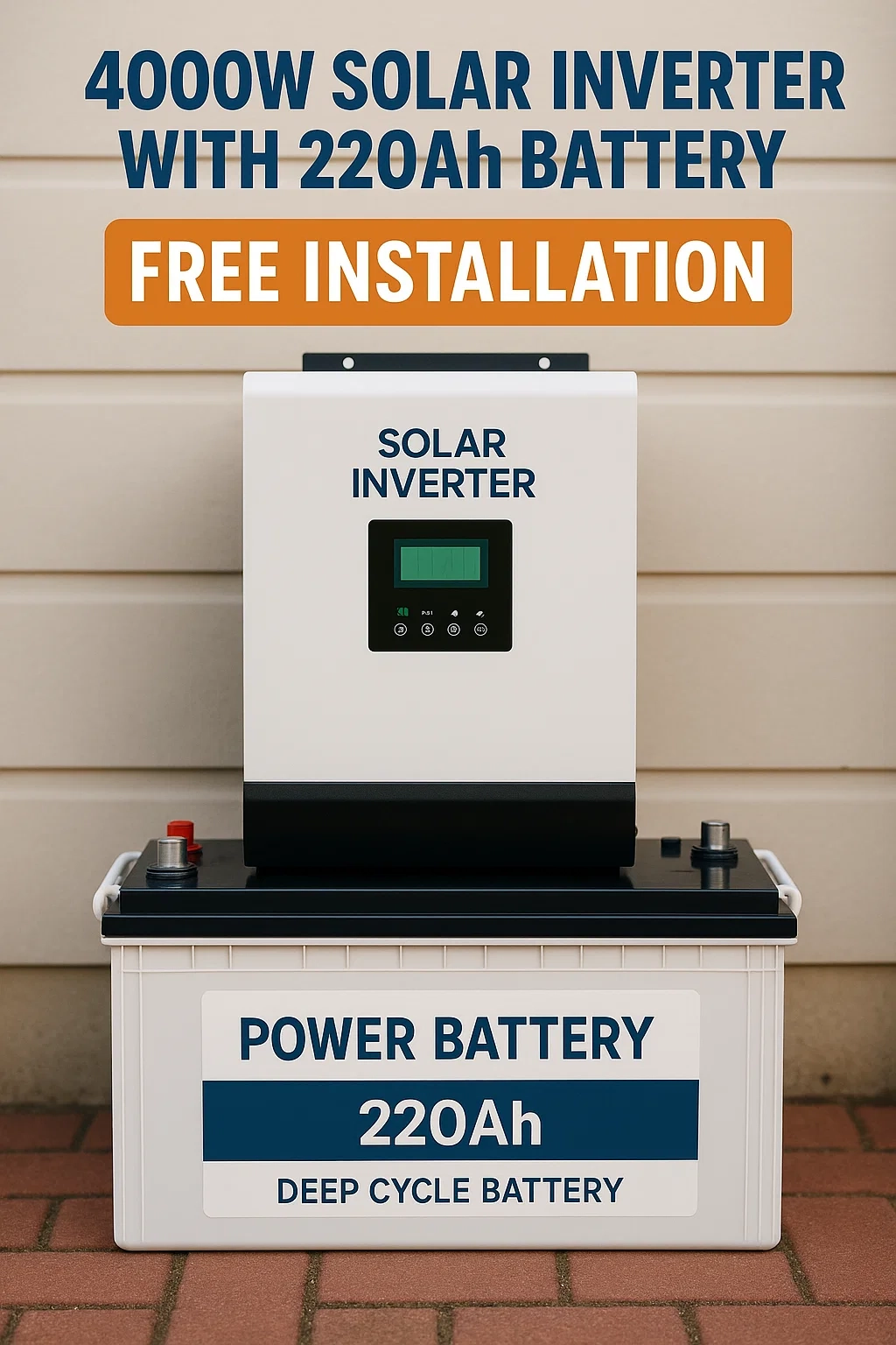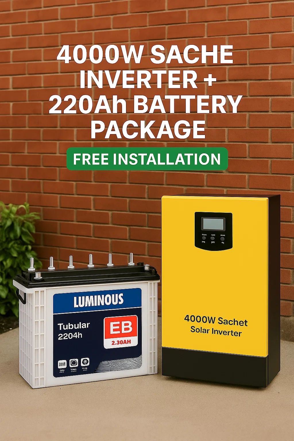 Ready to elevate your energy independence? Smartech’s expertly curated 4000VA Tranformerless Solar Inverter Installation Package is designed for superior performance, extended reliability, and exceptional value, catering to clients with significant power demands. This premium package is built around a powerful, high-efficiency 4000VA tranformerless inverter, boasts enhanced solar harvesting with four 300W panels, and provides robust energy storage with a 220Ah 12V DC dry cell battery for extended backup. We provide everything necessary for a seamless, protected, and incredibly powerful solar experience.