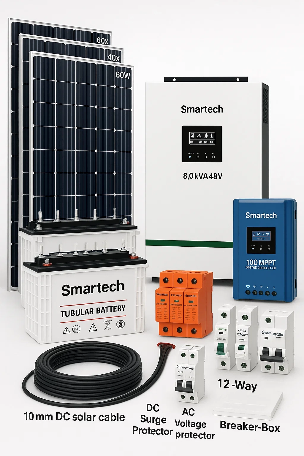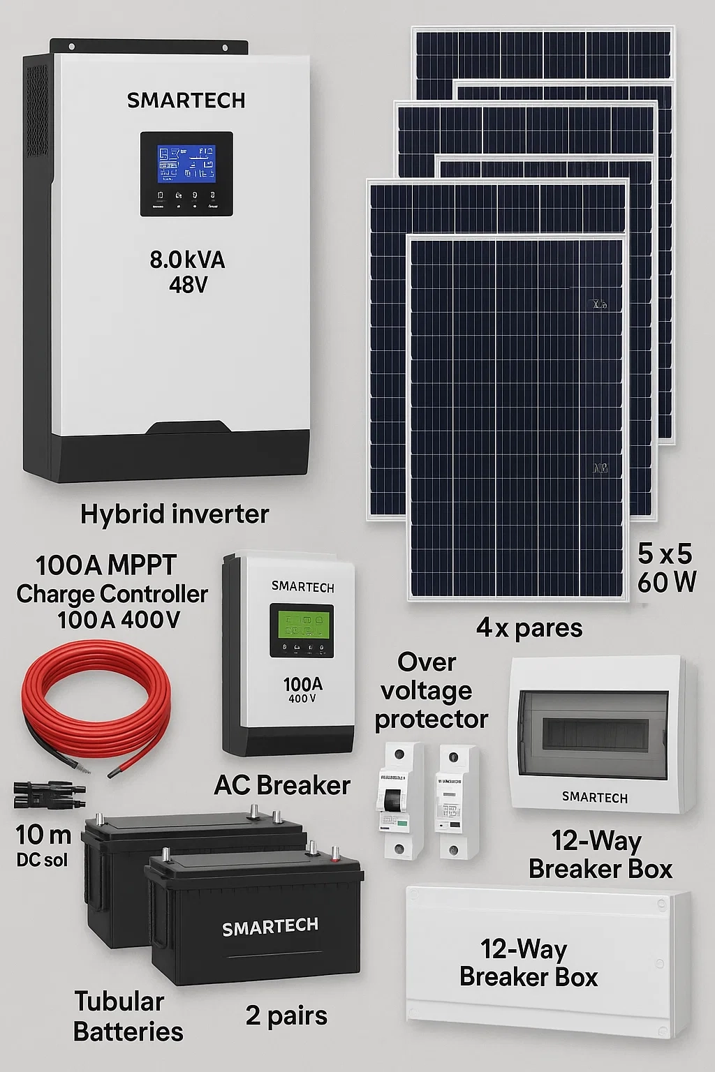 This system combines an 8.0 kVA hybrid inverter, 10 high-efficiency solar panels, and tubular deep-cycle batteries to deliver continuous power, day and night. Whether for homes, offices, schools, or small businesses, this package guarantees clean energy, lower bills, and complete peace of mind.