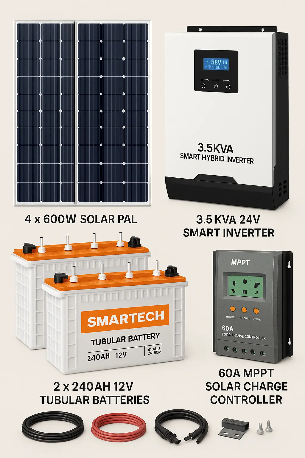 The 3.5kVA Solar Inverter Package can power several home and office appliances, including TVs, fans, lighting, laptops, routers, refrigerators, freezers, washing machines, and other medium to heavy loads. It’s perfect for small offices, shops, and residential homes that want reliable power 24/7.
