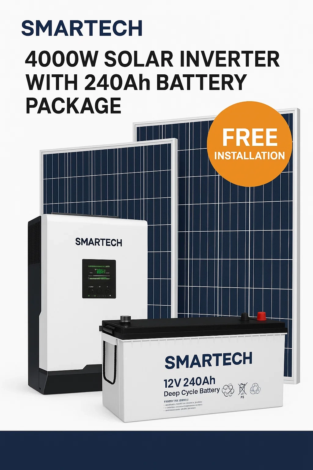For the client who demands performance and reliability without compromise, the Smartech 4000VA Tranformerless Solar Inverter Installation Package is your definitive solution. This system is a professional integration of high-end components designed to provide unwavering energy stability and extended operational runtime. The core unit, a 4000VA tranformerless inverter, ensures highly efficient energy conversion, maximizing the utility of every stored and generated watt.